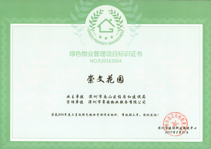 為落實(shí)深圳市住建局關(guān)于《深圳市綠色物業(yè)管理導(dǎo)則(試行)》指導(dǎo)精神,在保證物業(yè)服務(wù)質(zhì)量等基本要求的前提下,通過科學(xué)管理、技術(shù)改造和行為引導(dǎo),有效降低各類物業(yè)運(yùn)行能耗,最大限度地節(jié)約資源和保護(hù)環(huán)境,致力構(gòu)建節(jié)能低碳生活社區(qū)的物業(yè)管理活動(dòng),實(shí)現(xiàn)城市經(jīng)濟(jì)社會(huì)可持續(xù)發(fā)展目標(biāo),提高物業(yè)管理的科技含量和服務(wù)水平。2016年12月,在公司的正確領(lǐng)導(dǎo)和相關(guān)部門的積極配合下,通過項(xiàng)目全體員工的共同努力,我司“崇文花園”項(xiàng)目和“邁瑞總部大廈”項(xiàng)目順利通過了深圳市建設(shè)科技促進(jìn)中心的相關(guān)評(píng)審,分別獲得了“2016年度三星級(jí)綠色物業(yè)管理項(xiàng)目”證書和“2016年度一星級(jí)綠色物業(yè)管理項(xiàng)目”證書。