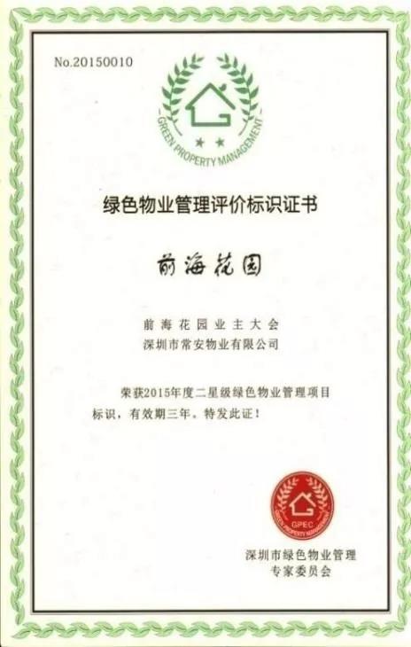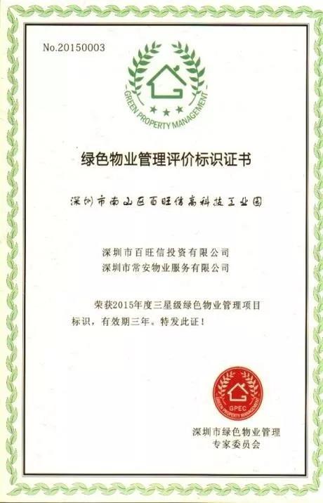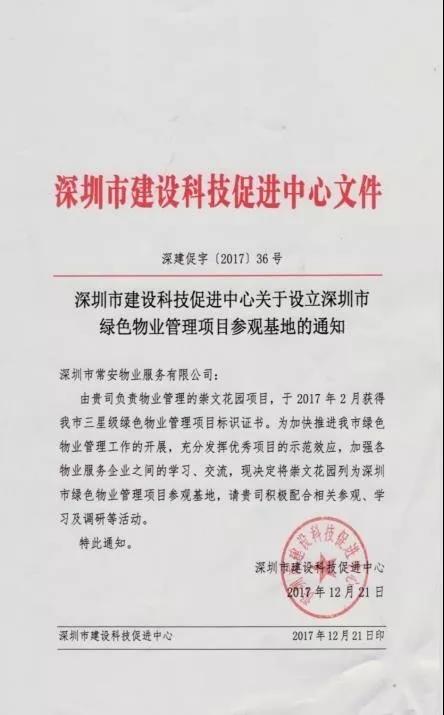 依據2011 年深圳出臺的首部《深圳市綠色物業(yè)管理導則(試行)》和 2013 年出臺的《深圳市綠色物業(yè)管理項目評價辦法和細則(試行)》,常安物業(yè)積極響應并開展綠色物業(yè)管理工作,2016 年至今,共有四個項目榮獲了深圳市政府部門頒發(fā)的綠色物業(yè)管理項目證書,其中崇文花園還被深圳市政府部門列為深圳市綠色物業(yè)管理項目參觀基地,2019年出任廣東省綠色供應鏈協會綠色物業(yè)管理專業(yè)委員會副主任委員單位。色物業(yè)管理