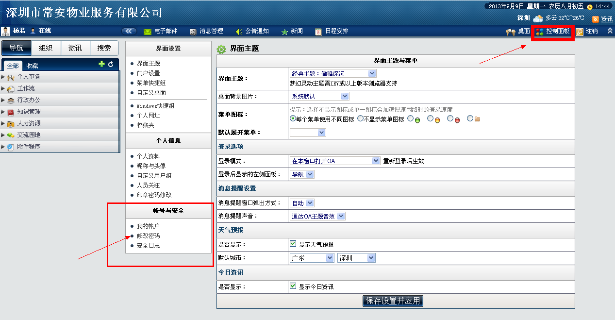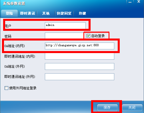 (4)OA地址(內(nèi)網(wǎng))修改成下面內(nèi)容[changanwuye.gicp.net:800]。用戶名首次登陸為自己的名字,沒有密碼。點擊保存。就可以直接登錄了。