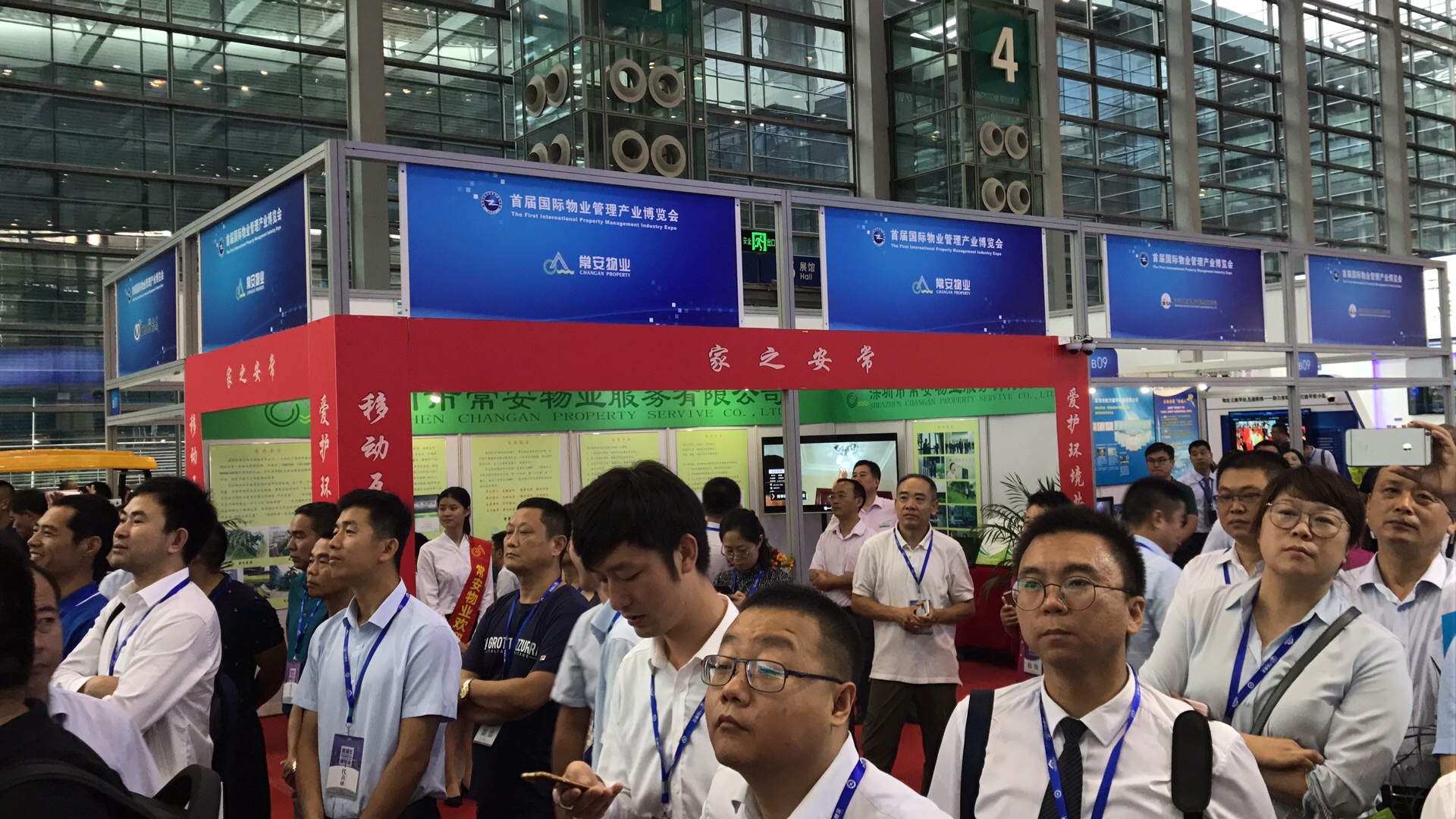 中國物業(yè)管理協(xié)會會長沈建忠及深圳市物業(yè)管理協(xié)會會長曹陽在常安物業(yè)公司展位前合影留戀