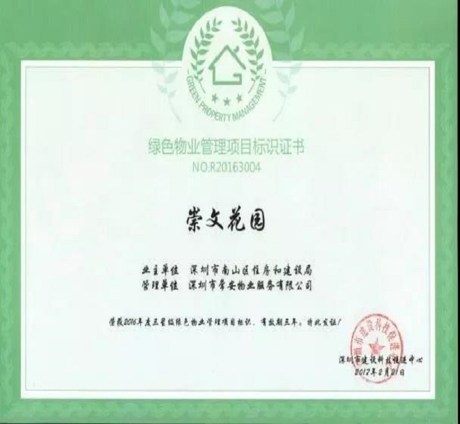 依據2011 年深圳出臺的首部《深圳市綠色物業(yè)管理導則(試行)》和 2013 年出臺的《深圳市綠色物業(yè)管理項目評價辦法和細則(試行)》,常安物業(yè)積極響應并開展綠色物業(yè)管理工作,2016 年至今,共有四個項目榮獲了深圳市政府部門頒發(fā)的綠色物業(yè)管理項目證書,其中崇文花園還被深圳市政府部門列為深圳市綠色物業(yè)管理項目參觀基地,2019年出任廣東省綠色供應鏈協會綠色物業(yè)管理專業(yè)委員會副主任委員單位。色物業(yè)管理