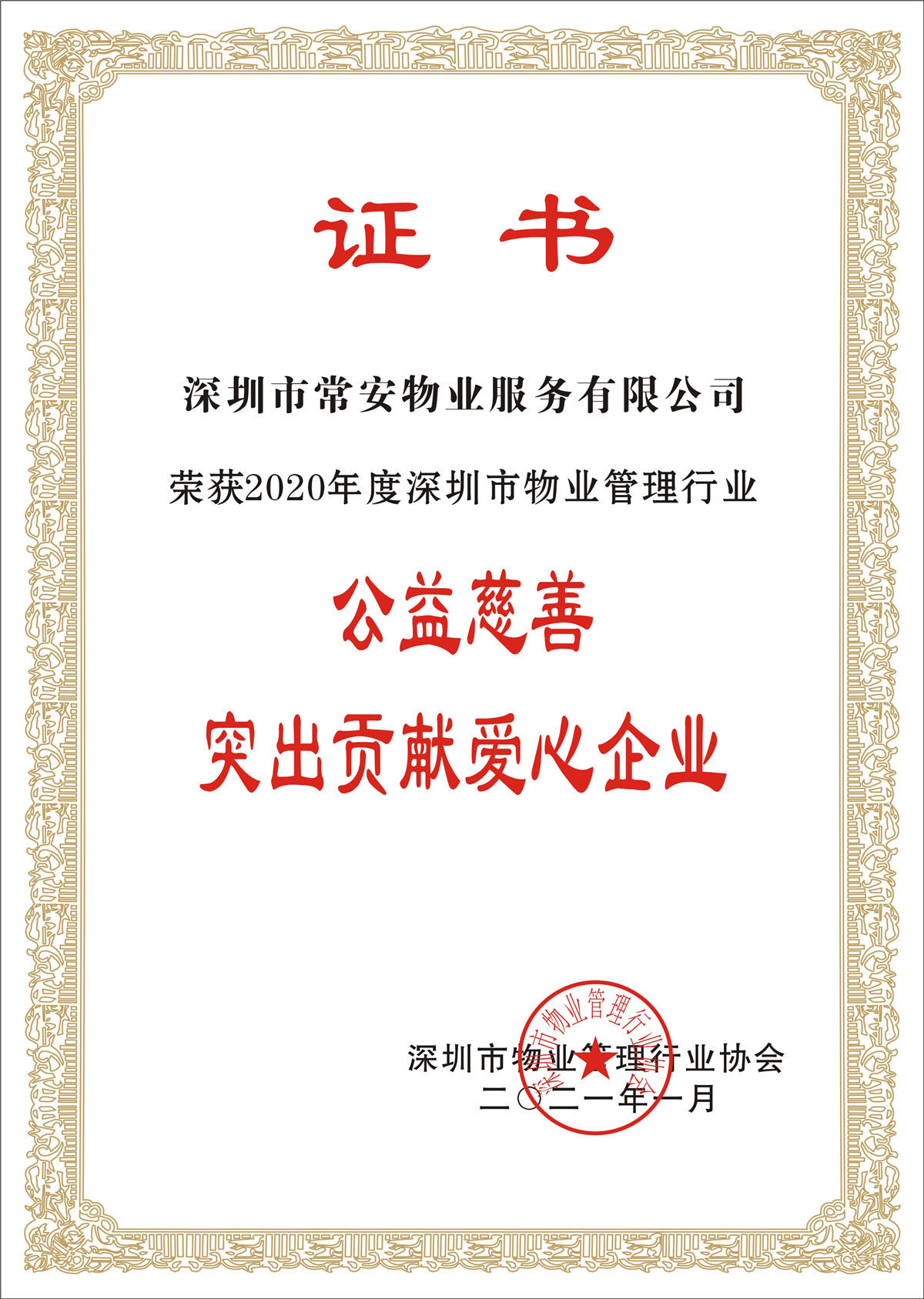 常安物業(yè)榮獲“2020年度深圳市物業(yè)管理行業(yè)公益慈善突出貢獻(xiàn)愛(ài)心企業(yè)”稱號(hào)